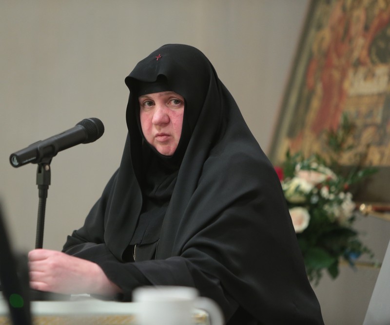 После доклада гостьи из Греции в президиум поступили записки с вопросами, касающимися современной жизни в монастыре. Один из них: как часто матушка проводит личные беседы с каждой сестрой? Настоятельница ответила, что поскольку в обители подвизается 59 насельниц, то у нее нет возможности беседовать с ними часто. Поэтому она просит излагать на бумаге, что больше всего ту или иную сестру беспокоит. А прочитав записки, уже принимает решение, в какой последовательности сестер к себе приглашать. Если же ничего экстраординарного нет, то личная встреча-беседа с каждой из них бывает где-то раз в месяц.