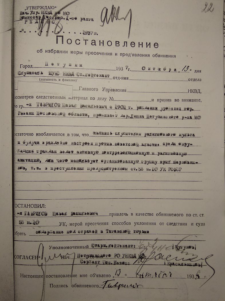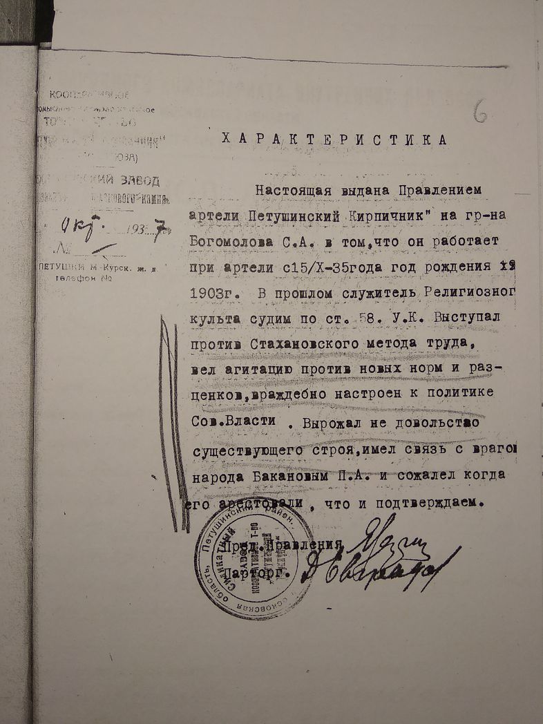 В  конце октября 1937 года в Петушках был арестован певчий, бывший дьячок Сергей Александрович Богомолов. Ему исполнилось тогда 34 года. Сергей родился в Москве 110 лет тому назад, 17 (4 по старому стилю) октября 1903 года. В следственном деле хранится выписка из метрических книг о его крещении в храме Илии Обыденного г. Москвы. Отец его, болховский мещанин, работал бухгалтером на машиностроительном заводе. Он умер рано, и 11-летнего Сергея Богомолова в 1915 году взял на воспитание настоятель Введенской Островской пустыни игумен (с 1920 года архимандрит) Павел (Ванюшин). Получив и образование, и церковное клиросное воспитание в обители, Сергей после ее закрытия в 1923 году остался верен архимандриту Павлу. Служил при нем псаломщиком, исполнял обязанности келейника. В 1927 году его как служителя религиозного культа лишили избирательных прав. А в 1930 году осудили по 58 УК статье к пяти годам концлагеря. Отбыв срок на строительстве Беломорканала, Сергей не имел права поселиться ближе 100 километров к Москве и стал жить в д. Старые Петушки, рядом со своим духовным отцом архимандритом Павлом. Устроившись рабочим на Силикатный завод, он также исполнял обязанности певчего в Успенской церкви. В 1935 году у них с женой Анной Петровной родилась единственная дочь Евгения.