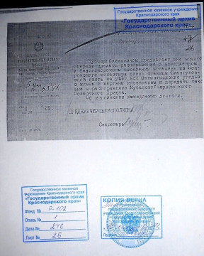 Выражаем глубокую благодарность сотруднику Государственного архива Краснодарского края Александру Владимировичу Бабичу за оказанную нам помощь.