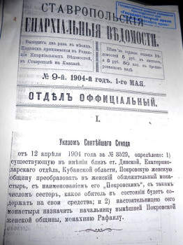 Найдены нами и еще насколько опубликованных исторических сведений о монастыре. Среди них – статья О.И. Шафрановой «Из истории создания женских монастырей на Северном Кавказе во второй половине XIX – начале XX вв.». Здесь начало создания общины описано так: «Новопокровская женская обитель (Покровский женский монастырь) образовалась по инициативе вдовы войскового старшины Анны Алексеевны Радченковой, которая пожертвовала земельный участок для устройства женского монастыря. Большую помощь в создании обители оказались монахини Ставропольского Иоанно-Марьинского монастыря, которые собирали средства для этого. К 14 октября 1896 года монахиня Иоанно-Марьинского монастыря Архелая построила на этом участке молитвенный дом, признанный благочинным готовым к освящению в честь Покрова Пресвятой Богородицы. Освящение состоялось 10 ноября 1896 года. Молитвенный дом был сделан из соснового леса, с одной главой, увенчанной металлическим крестом. С западной стороны к дому сделана пристройка из пяти комнат с особым крыльцом для житья монахинь. В 1897 году здесь проживали 64 монахини и послушницы. К 1903 году кроме молитвенного дома у общины имелось пять корпусов для помещения сестер, странноприимный дом, здание школы для детей из окрестных хуторов, дом для священников с надворными постройками, хозяйственный двор, строился большой кирпичный храм, заканчивалось строительство монастырской гостиницы. Как и в любой женской обители, при монастыре действовала школа смешанного типа. В 1914 г. в монастыре насчитывалось 114 монахинь».