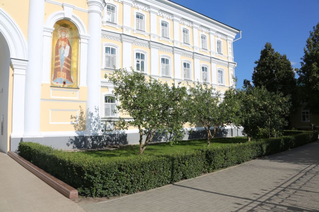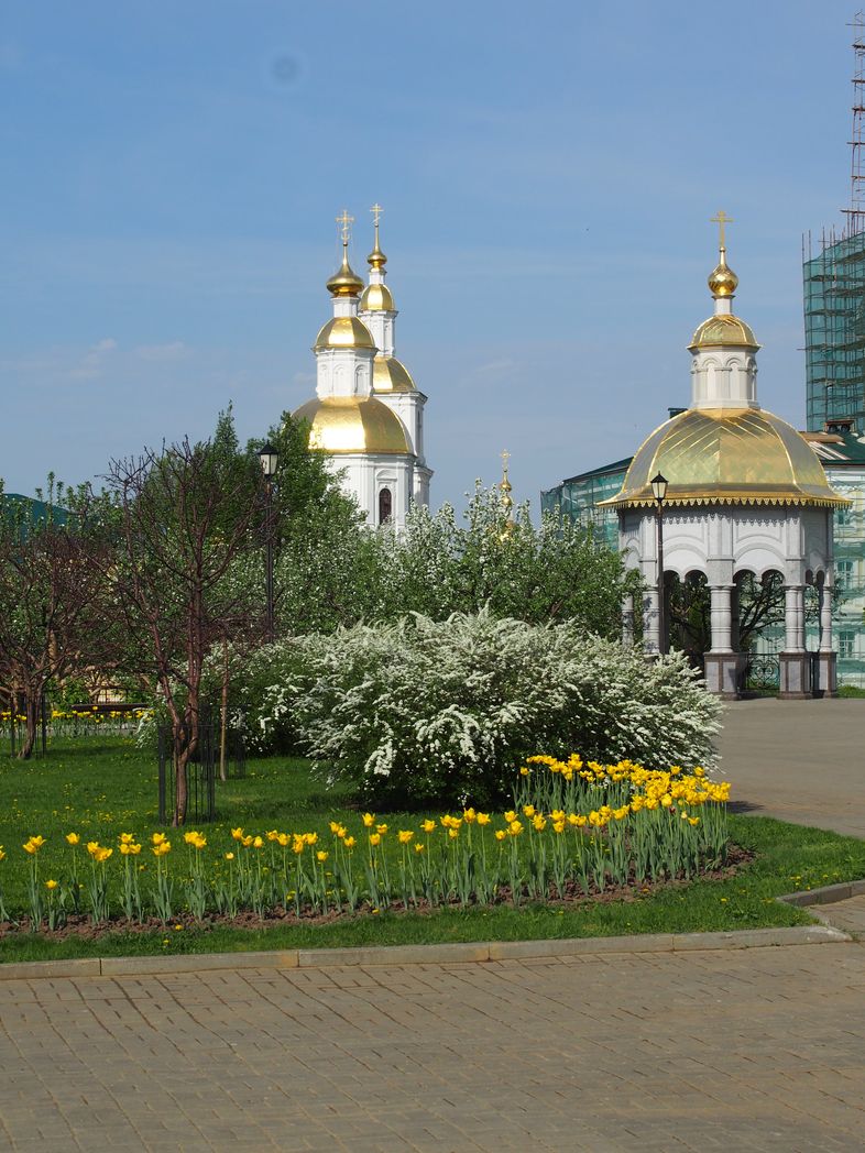 За алтарем Казанского собора – иной принцип оформления пространства. Сделана живая изгородь из туи, загородившая монастырь от проезжей части. На газонах растут многолетние растения разного времени цветения. Еще до того, как распускаются листья на деревьях, желтыми цветами покрываются ветки форзиции – это первые весенние цветы наряду с крокусами. В мае на смену желтым цветам форзиции приходят подобные невестам в белоснежном наряде кусты спиреи грифшейм. Позже расцветают пионы. Чтобы сад в течение наибольшего времени был живописным и красивым, необходим правильный подбор цветов. Требуется избежать ненужной пестроты, чтобы одни растения, особенно в группе, не скрывали за собой другие, не менее красивые.