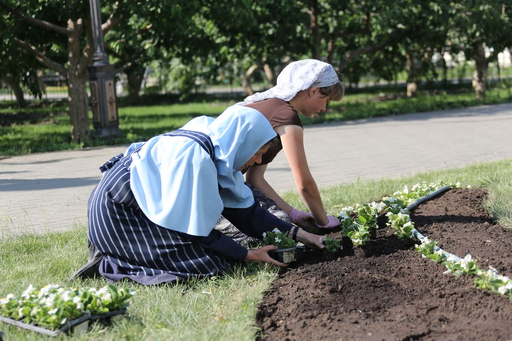 Рабочий день начинается в цветочном хозяйстве с молитвы. На сестер-цветочниц и их помощников ложится вся тяжелая работа: посадки, обрезка, удобрение, разрыхление почвы, сбор увядших цветов, прополка. Очень важно все это выполнять в определенные сроки. В поливе участвуют многие монастырские сестры: за ними закреплены участки. Летом на цветочном послушании помогают паломники и дети из монастырской школы, бывает до шестидесяти человек помощников. Но не каждому доверишь посадку и уход за растениями, их надо чувствовать и любить. Ведь какие-то растения нельзя заглублять, у других корень нельзя сильно прижать. Одни тень любят, другие солнышко. И влаголюбивые растения не все; некоторые поливаются непосредственно под корень, а другие орошаются поверху.