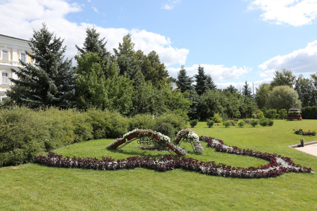 Выразительно выглядит дуга из пионов, ажурная пышная листва которых сохраняется до поздней осени. Но главным акцентом центральных газонов между колокольней и Троицким собором стали альпийские горки, которые прекрасно смотрятся на фоне сочного зеленого газона. Альпинарии – цветники с самыми необычными растениями и камнями-акцентами, с ансамблем хвойных кустов и деревьев. В них поражает обилие цветов. Тут душица, гвоздика, солнцецветы, бессмертник, песчанка, аквилегия, разнообразные примулы, пульсатилла, альпийская астра, кошачья лапка. Они не закрывают, а как изысканная рамка подчеркивают рукотворные, но очень естественные красивые холмики и каменистые пороги.
