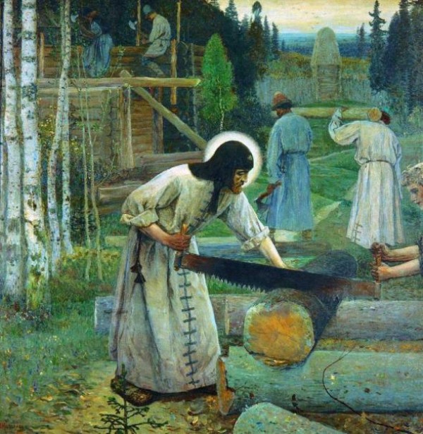 прпСергий строит церковь...В двадцатилетнем возрасте Варфоломей в поисках строжайшей аскезы и пустынножительства убедил своего брата Стефана основать в глухом Радонежском бору пустынь на берегу реки Кончура. Сегодня это Троице-Сергиева лавра. Она представляет собой целый город-крепость – более 50 зданий, созданных лучшими зодчими России на протяжении столетий. А когда-то здесь шумел дремучий лес и в этом глухом бору Варфоломей вместе со Стефаном трудились над сооружением первой деревянной церкви во имя Святой Троицы...