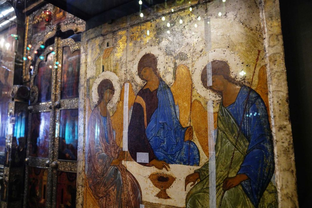 Троицкий собор – это главная святыня Лавры и великая святыня всей Русской Православной Церкви. Вместе с тем это также важный образец раннемосковского зодчества. Храмовой архитектуры рубежа XIV–XV веков сохранилось очень немного; чаще всего это лишь фрагменты фундамента и стен, поэтому Троицкий собор является важнейшим памятником архитектуры и имеет очень большое историческое значение. Безусловно, собор – живое воплощение почтения и любви к преподобному Сергию. В начале XV века Лавра была полностью разорена, и только любовь к учителю послужила тому, что братия вернулась на прежнее место и восстановила монастырь. Так, с древнейших времен Троицкий собор стал особо почитаемым наследием святого. Конечно же, он является и уникальным памятником фресковой росписи и иконописи. Сейчас мы не имеем росписей времени преподобного Андрея Рублева, от них практически ничего не сохранилось. Однако мы знаем от исследователей, Сергея Сергеевича Чуракова (советский художник-реставратор. Член Союза художников СССР. – М. Р.) и иных специалистов, что программа росписей XVII века во многом следовала росписям времени Андрея Рублева. Об этом, в первую очередь, свидетельствует композиционное решение. Конечно, в последующее время были и нововведения, однако бóльшая часть сюжетов – замысел преподобного Андрея. Не могу не поделиться очень важным для нас событием: совсем недавно в процессе реставрации на северном столбе за иконостасом был обнаружен небольшой фрагмент росписи, посвященной празднику Благовещения, который датируется XV веком и может принадлежать кругу Андрея Рублева.