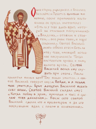 Пожалуй, задолго до пострига, во время работы на ферме. Жил я тогда в маленьком домике на колесах и уже стал познавать радость уединения. Я много, очень много читал – это были книги о святых отцах Церкви, о Православии. Также интересовался греческим языком. При своем скудном достатке я был вынужден самостоятельно учить греческий алфавит и еще слушал богослужебные песнопения на греческом. С интересом я прочитал в ту пору о странствиях будущего святителя, родившегося в Кесарии Каппадокийской (территория современной Турции) и отправившегося в Сирию, Египет и Палестину, чтобы увидеть своими глазами жизнь отцов-пустынников, изучить ее. Должен признаться: не столько огромное духовное наследие одного из трех Вселенских учителей Церкви меня, молодого человека, волновало, сколько его епископское служение, явившее живой пример доброго пастыря, сердечно заботившегося об обездоленных, больных и сиротах, чуткого к чужим бедам. И недавно, после болезни, когда мне оказалось трудно нормализовать режим сна, я вспомнил о некогда любимом занятии – каллиграфии – и занялся им. Вот переписал маленький рассказ о святителе Василии и попробовал изобразить его самого...