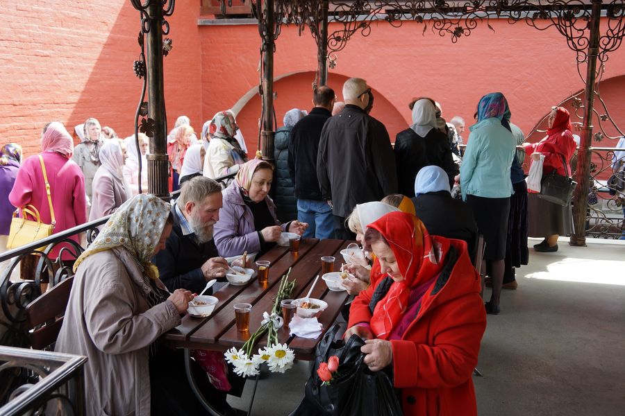 В праздники блаженной Матроны Московской многие люди проводят на территории обители почти весь день, т.к. очередь к мощам очень большая, поэтому монастырь каждый раз организует благотворительную трапезу на 20 тыс. человек.