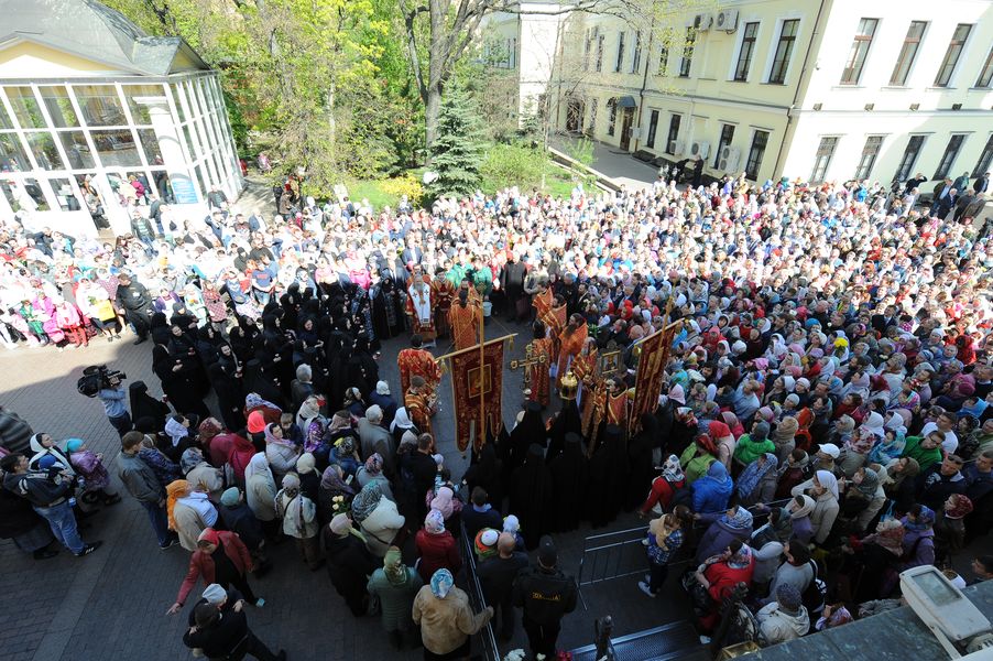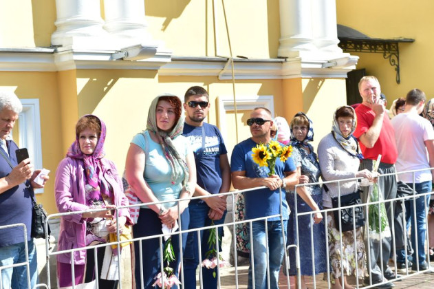 Мы заранее готовим дорожку, украшенную живыми цветами, вдоль которой выстраиваются паломники, и каждый хочет быть поближе, чтобы увидеть и сфотографировать Первосвятителя, получить благословение Его Святейшества. Следуя в храм, Святейший Патриарх Кирилл всегда благословляет прихожан, поздравляет их с праздником. За богослужением большинство паломников наблюдают по большому экрану, установленному на монастырской площади, т.к. наш большой Воскресенский собор не вмещает всех молящихся.
