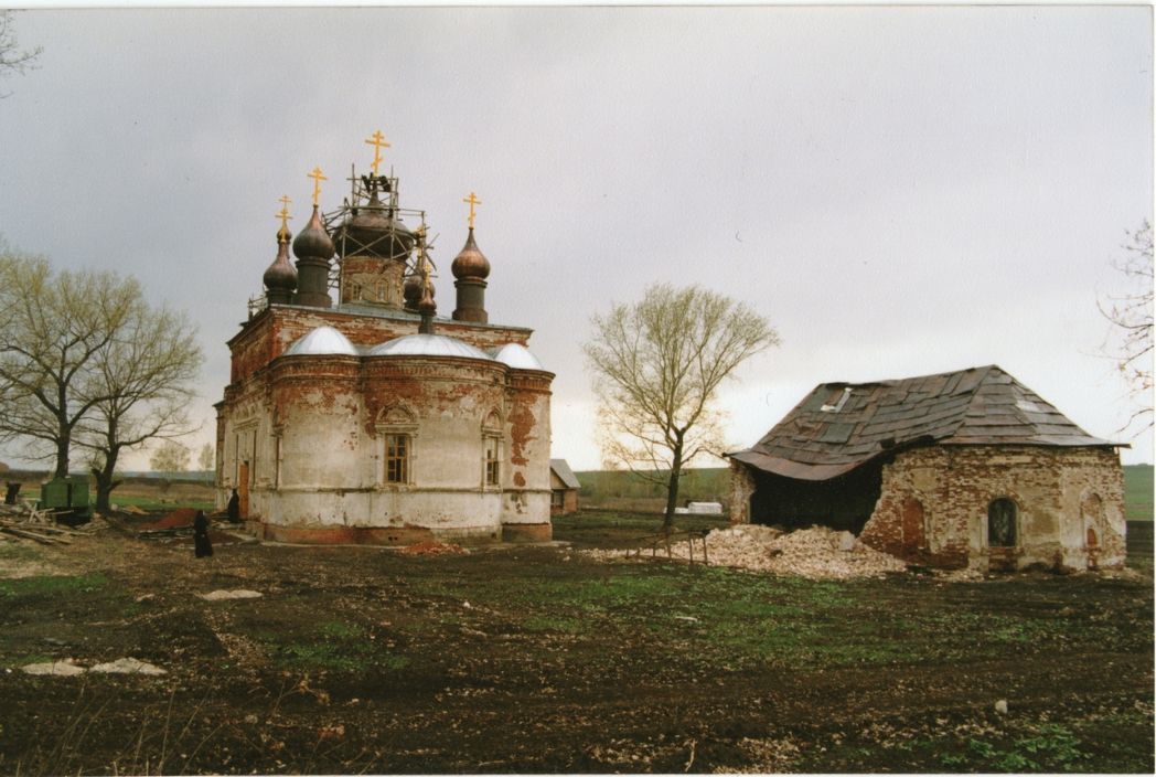 Здесь было полное бездорожье. На месте села – пустырь, два полуразрушенных храма и ни одного дома. Обвалившиеся стены, кучи кирпичей… Груды мусора были вынесены из церкви Архангела Михаила. Земляные работы осложнялись тем, что от прежних домов сохранилось множество ям, погребов и фундаментов. Ломалась техника, мы выносили камни и кирпичи со вспаханных огородов вручную. Других зданий, кроме храмовых, не было; мы поселились в деревянном вагончике. Везде – сорняки, а лопухи росли такие мощные, что их рубили топорами.