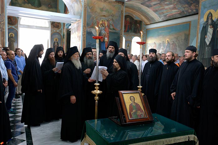 Более четверти века в Русской Православной Церкви существует традиция: ежегодно Cвященноначалие направляет для участия в престольном празднике Русского на Афоне Пантелеимонова монастыря, по новому стилю ― это 9 августа, официальную делегацию в составе архипастырей, священнослужителей и мирян. В текущем году по благословению Святейшего Патриарха Московского и всея Руси Кирилла паломническую группу довелось возглавить мне. Решением Священного Синода в поездке на Святую Гору приняли участие: митрополит Черновицкий и Буковинский Мелетий, архиепископ Женевский и Западно-Европейский Михаил, епископ Россошанский и Острогожский Андрей, епископ Владикавказский и Аланский Леонид, епископ Слуцкий и Солигорский Антоний, заведующий сектора протокола Отдела внешних церковных связей Московского Патриархата игумен Феофан (Лукьянов). Иерархов сопровождали священнослужители и миряне. Всего на праздник великомученика и целителя Пантелеимона нас приехало 17 человек. Если посмотреть на состав делегации, то увидим, что он отображает обширность канонической территории нашей Церкви. Митрополит Мелетий представлял Украинскую Православную Церковь, владыка Михаил ― Русскую Православную Церковь Заграницей, епископ Андрей ― епархию Центральной России, входящую в состав Воронежской митрополии, Преосвященнейший Леонид ― епархию на территории республик Северного Кавказа, владыка Антоний ― Белорусский экзархат, мое служение совершается в Казахстанском митрополичьем округе.