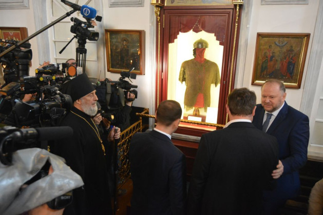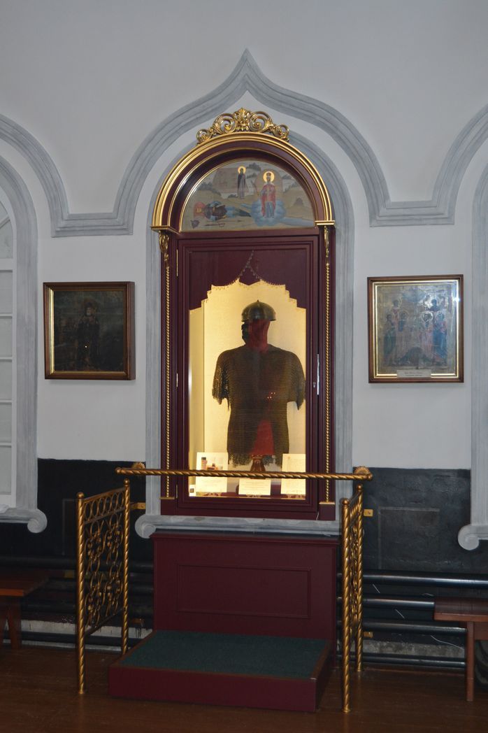 В прошлом году монастырю на временное хранение передали очень значимые для нас реликвии – кольчугу и шлем, подаренные, по преданию, основателю обители преподобному Далмату Исетскому татарином Илигеем в середине XVI века после видения иноверцу Божией Матери. Несколько столетий эти реликвии находились на гробнице преподобного Далмата, а после разорения обители в 30-х годах прошлого века попали в музеи Свердловской области. Передача музейных экспонатов для длительного экспонирования в стенах действующего храма стала возможной благодаря содействию Полномочного представителя Президента РФ в УрФО Н.Н. Цуканова и Губернатора Курганской области В.М. Шумкова и проведению большой подготовительной работы в монастыре. На средства благотворителей изготовили и установили соответствующую всем требованиям и украшенную снаружи резьбой с позолотой музейную витрину, позволяющую поддерживать необходимый температурно-влажностный режим.