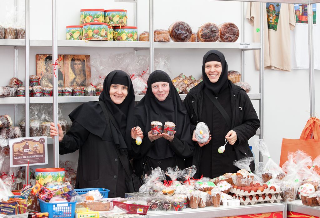В это время года ярмарки устраиваются на улице, у монастыря есть специальное оборудование (праздничные шатры), которое наша команда возит с собой по городам и странам. На территории обители сестры в пасхальных палатках предлагают прихожанам праздничное угощение и сувениры.