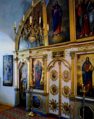 – А вот тут (показывает на глубокую нишу с окном) нужно устроить Гефсиманию, где будет храниться плащаница Божией Матери. А на стене над аркой прямо так и написать: ГЕФСИМАНИЯ». Так мы и сделали, поместив туда плащаницу Пресвятой Богородицы и подвесив к потолку в арке целую гирлянду замечательных старинных лампад.