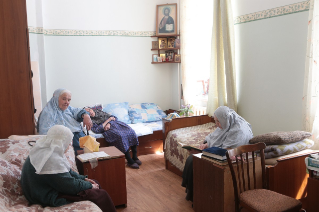 ...Жизнь обитательниц богадельни протекает спокойно, размеренно. Утром – Божественная литургия в храме преподобного Амвросия Оптинского или в домовом храме «Утоли моя печали». Затем трапеза в богадельне, во время которой, как и положено в монастырях, читается житие кого-то из святых. После трапезы отдых, после отдыха – посильный труд, о чем уже говорилось (чистка овощей, резка зелени для стола). Снова отдых и вычитывание молитвенного правила. В теплую пору года – прогулки на свежем воздухе, пешком или на инвалидной коляске. Кого нужно помыть, переодеть, хожалка все сделает. Кому нужна медицинская помощь, – пожалуйста, своя монастырская больница имеется, как и в дореволюционной обители, со стационаром и амбулаторией.