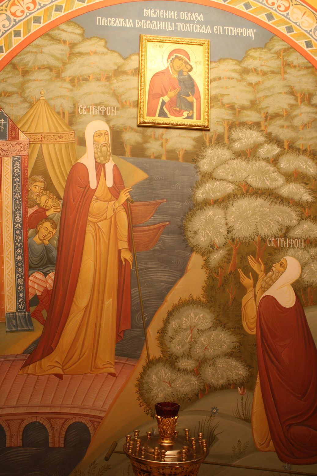 monasterium.ru-tolga-01Это предание знают все побывавшие в Толгском монастыре. Как однажды, в 1314 году местный владыка Трифон (до принятия схимы Прохор), объезжая епархию, остановился на ночлег на правом берегу Волги, напротив устья речки Толги. В полночь владыку разбудил яркий свет. Он поднялся, взял свой архиерейский посох и, обойдя спящую безмятежным сном стражу, вышел из шатра. И взору владыки Трофона предстала удивительная картина: за рекой, над лесом возвышался огненный столп, а через реку был перекинут мост, которого не было несколько часов назад. Благоговейно помолившись, святитель вступил на чудесный мост. Приблизившись к огненному столпу, владыка Трифон увидел в воздухе в ореоле света над верхушками деревьев образ Пресвятой Богородицы с Богомладенцем на руках. Долго со слезами молился владыка перед дивным образом, а потом по чудесному мостику вернулся в свой шатер.
