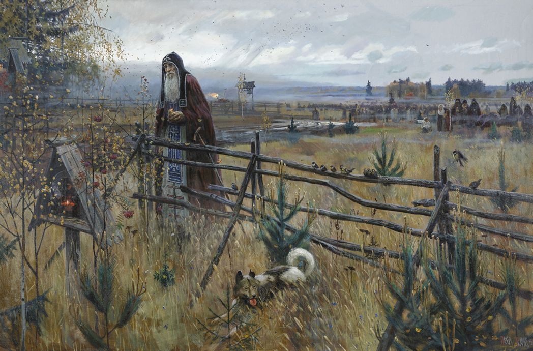 Молитва «звучит» и в картине «Сергий» (2013). Молитва за умерших и живых, за тех, кто находится за ним, и – за всю Россию. Всеобъемлющее значение молитвы святого подчеркнуто бескрайностью окружающего мира, который развертывается за спиной преподобного Сергия. Этой цели служит и мотив дороги, уходящей куда-то влево и теряющейся в пространстве, и высокая, чуть «размытая» линия горизонта.