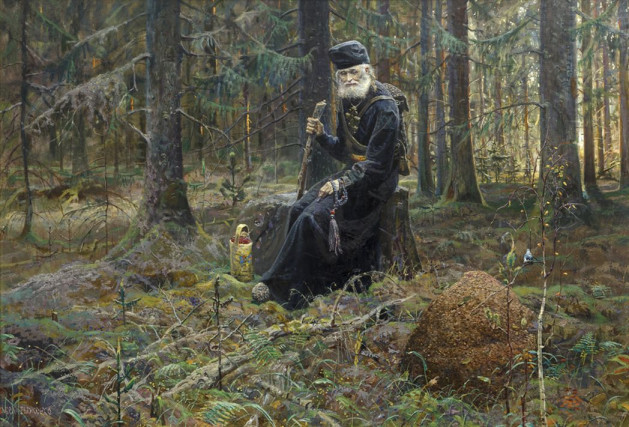 В работе «Силуан Афонский» – тоже показана гармоничная жизнь монаха с окружающим миром, мотив «Блажен, иже скоты милует» (Притч. 12:10). А еще – изображение колодца, который напоминает нам о встрече Христа с Самарянкой и Его слова: «Кто будет пить воду, которую Я дам ему, тот не будет жаждать вовек; но вода, которую Я дам ему, сделается в нем источником воды, текущей в жизнь вечную» (Ин. 4: 14–15).