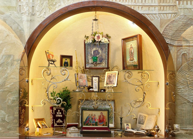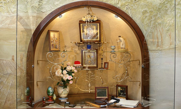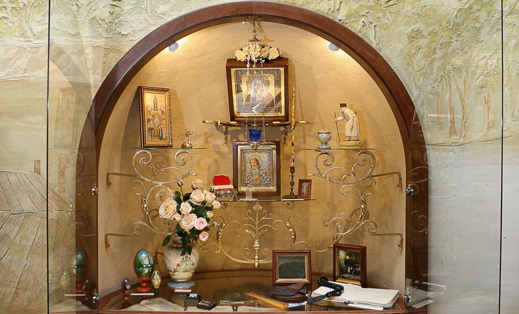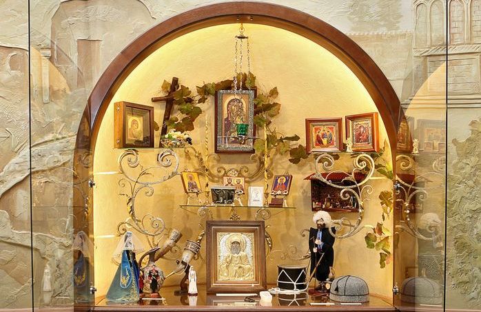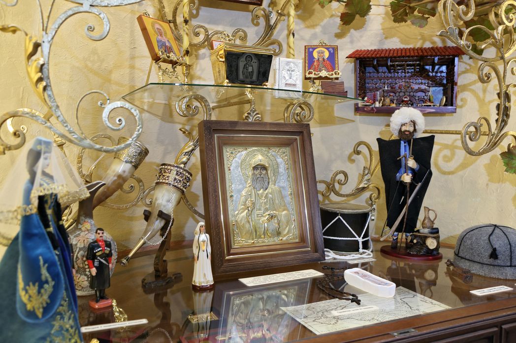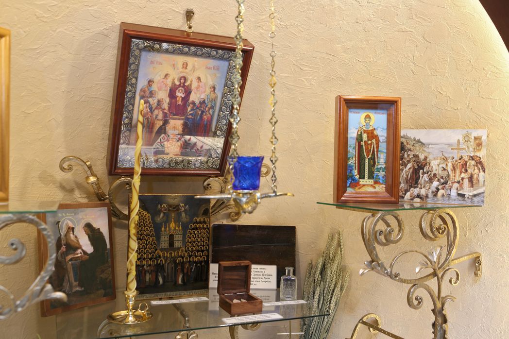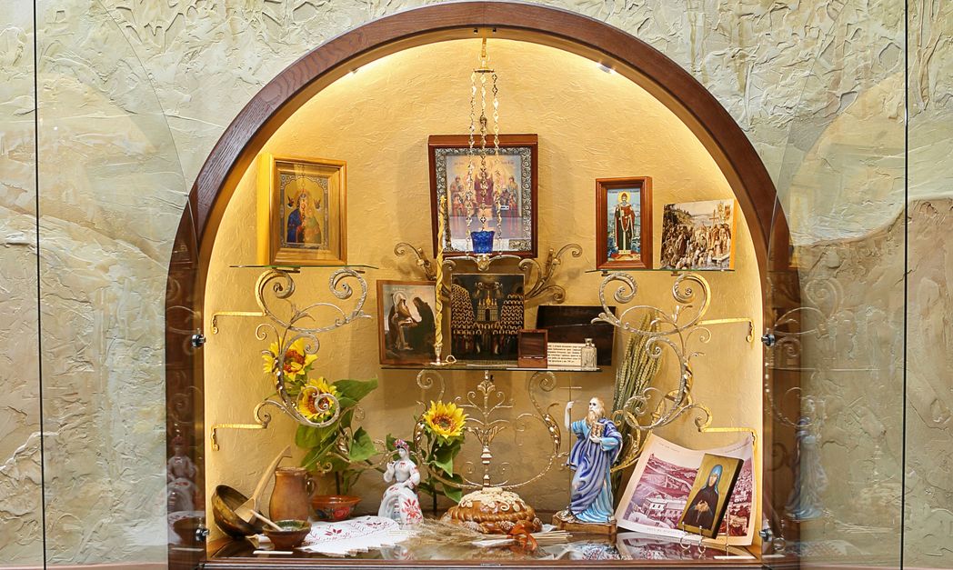 Рядом со святынями мы видим монашеское рукоделие, изделия народных промыслов, предметы раскопок, подарки и сувениры. Образ каждого удела венчает особенно почитаемая в нем икона Божией Матери.