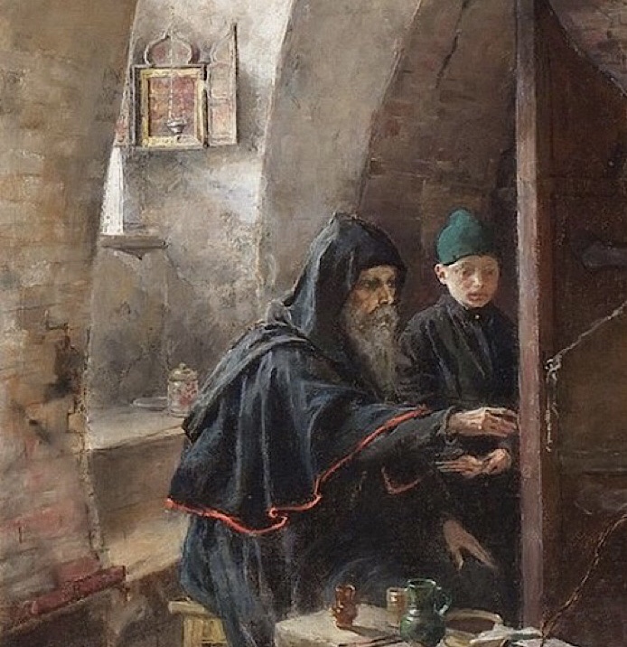 А вот Александр Головин (1863–1930) в своей работе 1894 года «В иконописной мастерской. Древнерусский иконописец» сделал акцент именно на иконописце.