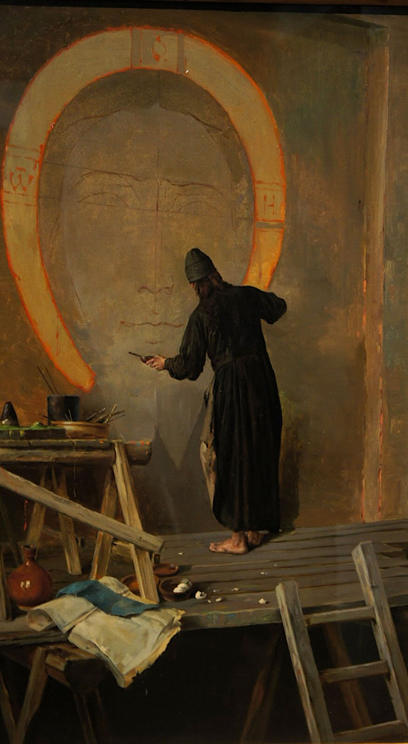 Чудо появления образа под руками иконописца стремился передать Александр Янов (1857–1918) в работе «Инок-живописец» 1885 года. Иконописец показан за работой, росписью храма. Но зрителю кажется, что образ Спасителя словно сам появляется, точнее, проявляется на стене – нимб Христа сияет золотом – светом, напоминающим нам о свете нетварном, а иконописец – просто свидетель этому. Смиренная поза иконописца подчеркивает это – он словно одновременно пишет и преклоняется. Но, когда зритель отведет взгляд от смыслового центра композиции, рассмотрит работу более внимательно, он увидит и рабочую импровизированную мастерскую – кисти, яичную скорлупу на полу (краска готовится прямо здесь). И получается, что картина изобразительными средствами формулирует смысл работы иконописца. С одной стороны, мы, глядя на образ Спасителя, словно проявляющийся на стене, вспоминаем историю царя Авгаря, плат, на котором, по желанию Христа проявился Его лик, то есть, первообраз, иконографию образа Спаса Нерукотворного… С другой – мы видим, что важен и труд иконописца, ведь иначе здесь, на стене храма, образ бы не появился, важно духовное, молитвенное состояние, мастерство.