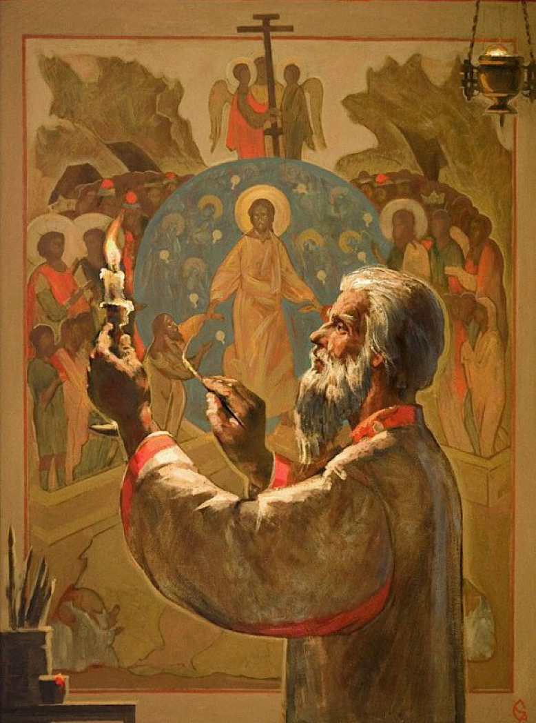 «Русская икона показывает не столько борьбу с падшей природой, сколько победу над этой природой, стяжанную свободу, когда закон Духа творит красоту души и тела, уже не подчиненных закону греховному (Рим. 7, 25; 8, 2)» – пишет Леонид Успенский в своем труде «Богословие иконы». И, чуть дальше: «В пределах художественного языка именно России дано было явить глубину содержания иконы, высшую степень ее духоносности». А потому тема труда иконописцев, создания ими святых образов просто не может не волновать художников, пишущих светские работы.
