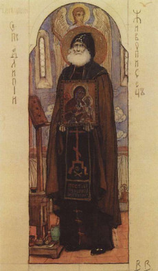 Не могли художники обойти вниманием и великих иконописцев, некоторые из которые причислены к лику святых. Картина Василия Раева (1808–1871) «Блаженный Алипий, иконописец Печерский» (1848) – это, с одной стороны, иллюстрация к рассказу из Киево-Печерского патерика. Святой, перед самой кончиной, писал икону Успение Божией Матери, но из-за болезни, никак не мог закончить ее в срок. И ему помог Ангел в облике «некоего юноши светлого». Последние слова святого были: «Ангел написал ее <икону>, и вот Он стоит возле меня, и хочет меня взять с Собою», после которых он умер.