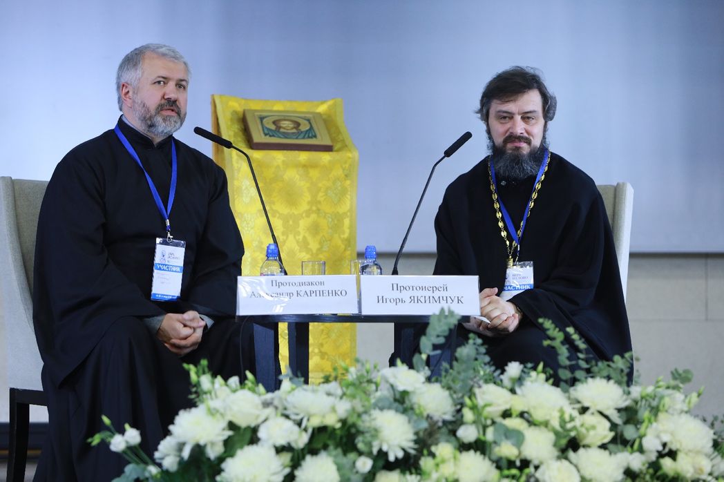 Панельное заседание вели секретарь ОВЦС Московского Патриархата по межправославным отношениям протоиерей Игорь Якимчук и протодиакон Александр Карпенко, главный редактор журнала «Фома в Украине». Люди, которые не нуждаются в особом представлении. Однако уместно вспомнить, что буквально накануне фестиваля Указом Президента Российской Федерации В.В. Путина отец Игорь был награжден медалью ордена «За заслуги перед Отечеством II степени». Эта государственная награда присуждена священнослужителю ««за большой вклад в развитие международных и межконфессиональных отношений, многолетнюю добросовестную работу». Что касается отца Александра, то он работает в журналистике почти четверть века, а журнал «Фома в Украине» возглавил в 2014 году.