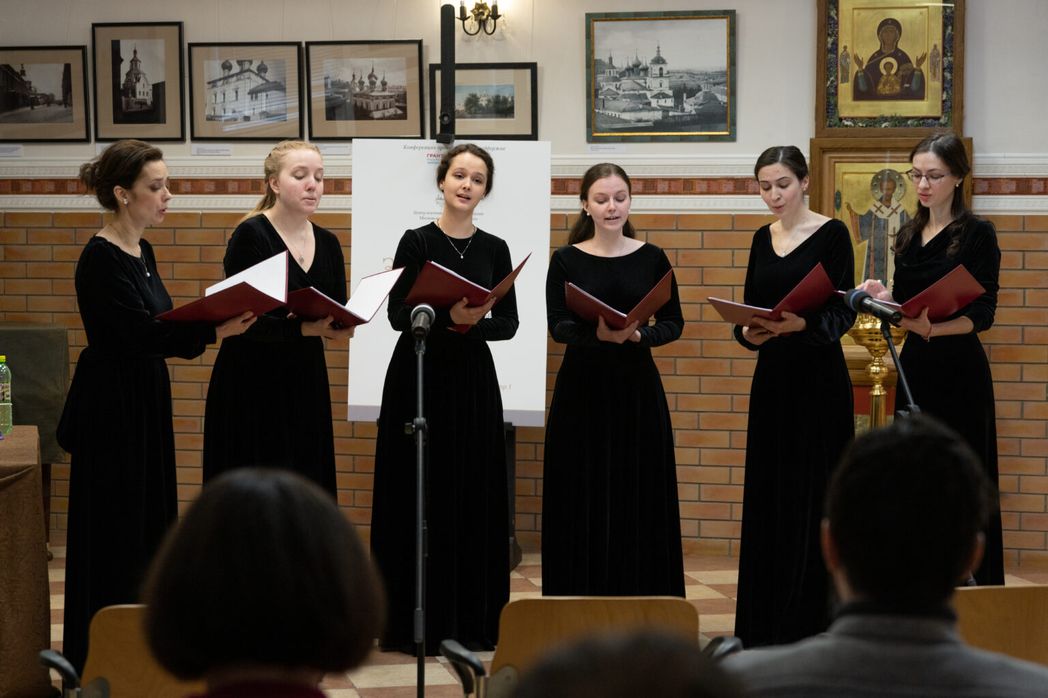 Центр изучения истории и наследия Московского Златоустовского монастыря любит делать подарки участникам Чтений. В этот раз подарком стала экскурсия по территории Достопримечательного места «Златоустов монастырь» с VR-очками. Участники форума смогли переместиться в фотореалистичное виртуальное пространство и увидеть, как в современном городском ландшафте оживает древний монастырь. Поднялись они на колокольню – конечно, виртуально (ее последней из монастырских строений разрушили) – и посмотрели на территорию монастыря с высоты птичьего полета. Впечатляюще! А другим приятным подарком стали выступления ансамбля «Sei cantanti» (в переводе – «Шесть певцов»), которым руководит Елена Щеглова, преподаватель отделения «Дирижирование академическим хором» Государственного музыкально-педагогического института имени М.М. Ипполитова-Иванова. Благодаря выпускницам знаменитой Ипполитовки, к слову сказать, недавно отметившей свой столетний юбилей, участники Чтений словно бы погрузились на какие-то мгновения в атмосферу минувших веков и явно себе представили, что могло бы звучать в стенах прославленной обители. Этому, думается, помогли также доклад Е.Д. Щегловой «История русского церковно-певческого искусства: «звучащие фрески» и доклад кандидата искусствоведения, ведущего специалиста Мемориального музея-квартиры Ел. Ф. Гнесиной (при РАМ имени Гнесиных) Н.А. Потемкиной «Монастырские певческие обиходы 1-й половины XVIII века из московского Златоустова монастыря и нижегородской Флорищевой пустыни».
