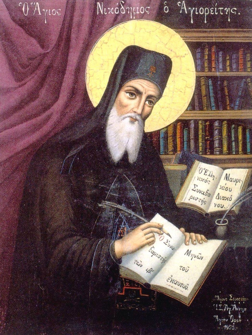 Вспомним, что преподобный Никодим Святогорец – в какой-то степени наиболее близкий нам по времени святой, живший в XVIII – начале XIX века. На одном из самых распространенных иконописных изображений он сидит с пером в руке над раскрытой книгой. Практически вся жизнь подвижника прошла над книгами, по большей части представляющими собой святоотеческие творения. Перу Никодима Святогорца принадлежит и замечательный памятник поствизантийской гимнографии – молебный канон святителю Иоанну Златоусту, в котором подчеркивается, что святой Златоуст – это секира, отсекающая отчаяние, потому что поучение о покаянии не приводит к ниспадению в глубину отчаяния. Такое образное сравнение... Есть в том каноне и другие удивительные по смыслу слова: «После Павла второй Павел – уста благодати...». Второй после апостола Павла! Вот каким виделся преподобному Никодиму великий подвижник IV века.