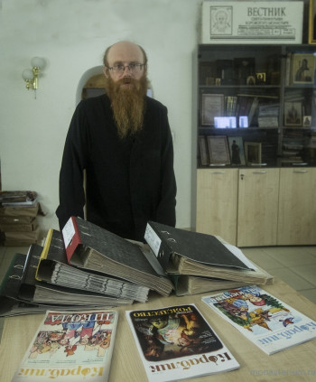 Детская тема также звучала в монастырском издательстве, где мы познакомились с его главным редактором – иеромонахом Иосифом (Королевым). Надо сказать, что у отца Иосифа очень много послушаний, начиная с келейничества у схиархимандрита Власия и заканчивая настоятельством на Покровском подворье в Высоком. Одно из его детищ – детский журнал «Кораблик», издаваемый по благословению владыки Климента монастырскими силами. В журнале много статей, авторами которых являются сами дети. Например, десятилетний Илья Дубовицкий ведет научную колонку. В одной статье он размышляет, как связаны между собой космос, Христос и Циолковский. В рубрике «Учеба» десятиклассница Евангелина Грибкова делится важным для многих школьников опытом, как она справилась с боязнью экзаменов. (Привлекает и бодрый заголовок – «Элементарно, Ватсон!»). Житийный материал о святом (рубрика «Вера») тоже имеет заголовок, мимо которого не пройдешь: «Босой владыка (Знакомимся с Иоанном Шанхайским)». Какой номер ни возьми, чувствуется, что сделан он с большой любовью к детям и их родителям. Причем многие материалы содержат такие интересные мысли, что, пожалуй, способны заинтересовать разновозрастную аудиторию. А в ближайшее время, как сообщил отец Пафнутий, по просьбам родителей монастырь будет издавать и «Лодочку» – журнал для маленьких.