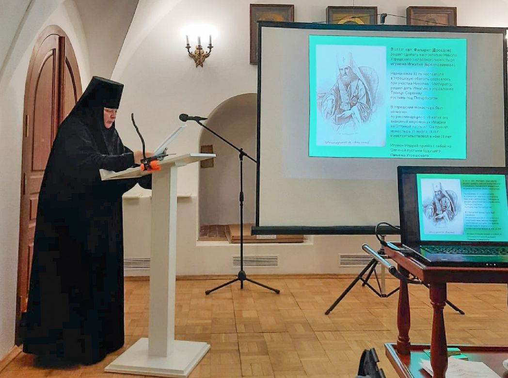 Вероятно, по Божию Промыслу нужно было дождаться, пока у Высокопреосвященного владыки митрополита Московского Филарета (Дроздова) в подробностях созреет идея создания в Москве общежительных монастырей, первым из которых он назначил быть Иоанно-Предтеченскому. Вся более чем двадцатилетняя эпопея со строительством и возрождением монашеской жизни на Ивановской горке была разносторонне освещена в нескольких докладах, тесно связанных друг с другом по содержанию. М.Д. Смирнова, кандидат филологических наук, старший преподаватель кафедры немецкого языка и регионоведения факультета иностранных языков МГУ им. М.В. Ломоносова посвятила выступление непосредственно роли святителя Филарета в возобновлении Ивановской обители. С.В. Духанова, советник Управы Дмитровского района Москвы и экскурсовод Иоанно-Предтеченского монастыря рассказала о двух замечательных женщинах, фактически на своих плечах вынесших финансирование и все труды по строительству, – Елизавете Алексеевне Макаровой-Зубачёвой и Марии Александровне Мазуриной. Монахиня Феонилла (Харченко) сообщением о деятельности прп. Пимена Угрешского и Комиссии по возобновлению монастыря подвела итог этому разделу конференции.