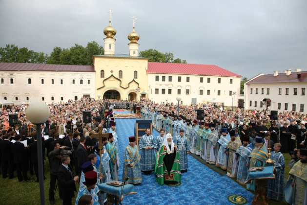 Начинается крестный ход. Его возглавляют Святейший Патриарх Алексий и митрополит Герман. Святыню в бронированной капсуле несут представители духовенства в голубых облачениях, традиционных для Богородичных праздников. Благолепие празднику придают несколько мужских и женских хоров.