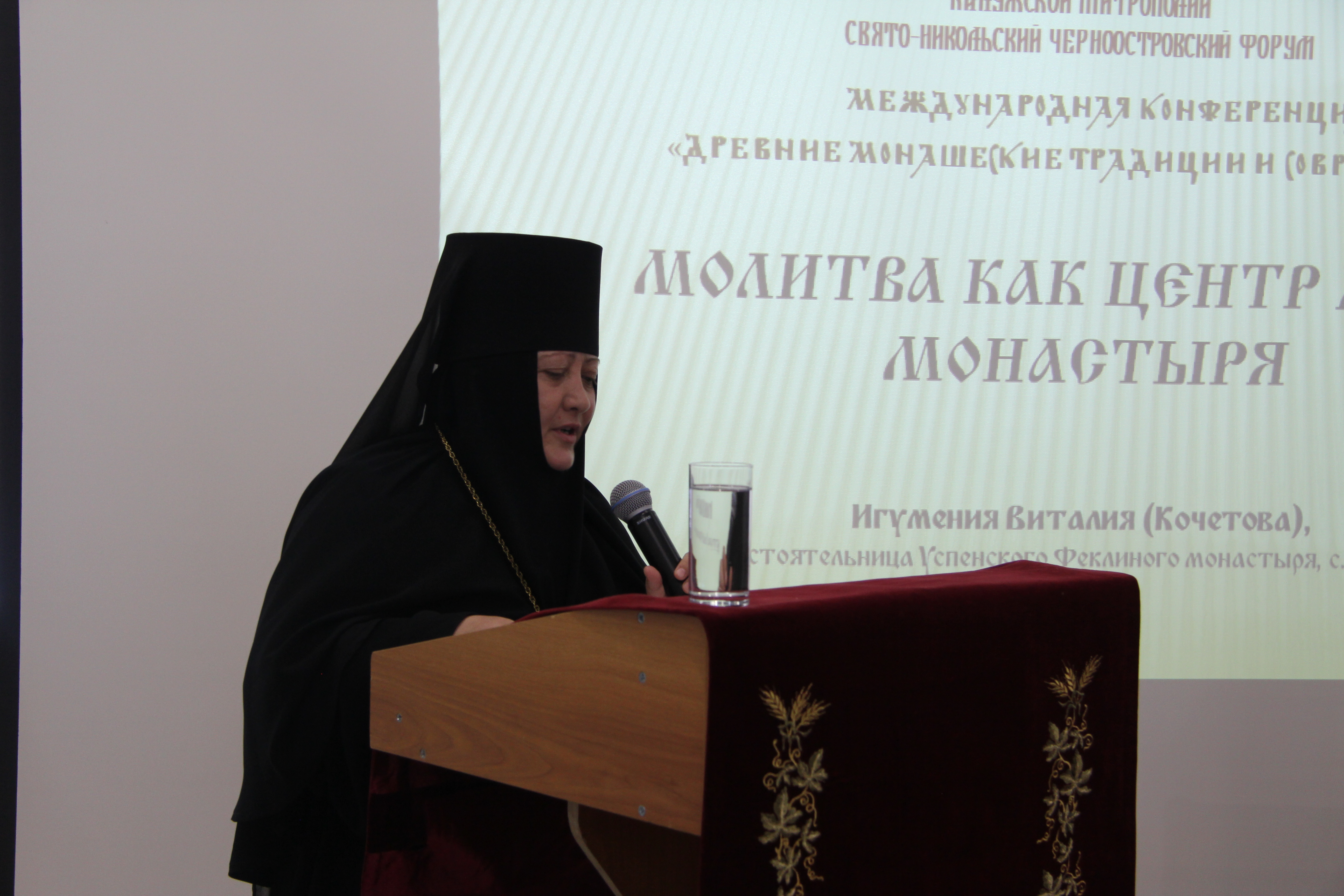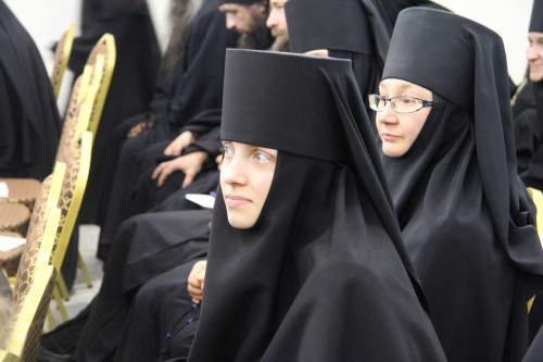 Еще две игумении из дочерних обителей – настоятельница Спасо-Воротынского монастыря матушка Анастасия (Мордмиллович) и настоятельница Успенского Феклиного монастыря с. Сенино матушка Виталия (Кочетова) – выступили на монашеской конференции с докладами: «Монашеские обеты как основа для формирования духовно-здоровой личности» и «Молитва как центр жизни монастыря». В них были затронуты вопросы необратимости монашеских обетов; ответственности игумена или игумении за понимание каждым братом или сестрой наиважнейшего правила монастырской жизни: посещение храма – это не формальная обязанность физического присутствия в храме, а таинственное собеседование с Богом. Цитируя преподобного Симеона Нового Богослова («Кто ропщет за обыкновенными службами, тяготится ими.., тот враг Божий и чужд Царствия Небесного»), игумения Виталия заметила, что первый признак порчи продукта определяется по гниению, изменению цвета и вкуса, появлению дурного запаха. А душа бестелесна, она не может издавать запах и менять вид. Но есть верный признак омертвения души – уклонение от церковных служб. И это представляет особую опасность для монашествующих, поскольку монастырь без молитвы – уже не монастырь, а что-то, по словам Матушки, напоминающее советский колхоз. Богослужебный круг она образно назвала золотым кольцом, которым монахи обручаются с вечностью.