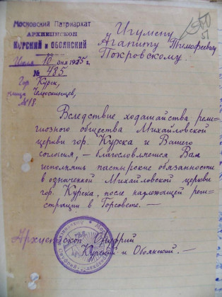 Среди многочисленных обвинений, которые летом 1935 года были предъявлены Курскому архиепископу Онуфрию (Гагалюку), встречается и такое: «реставрация метода по созданию кадров монашества, действовавшего до роспуска и ликвидации монастырей».