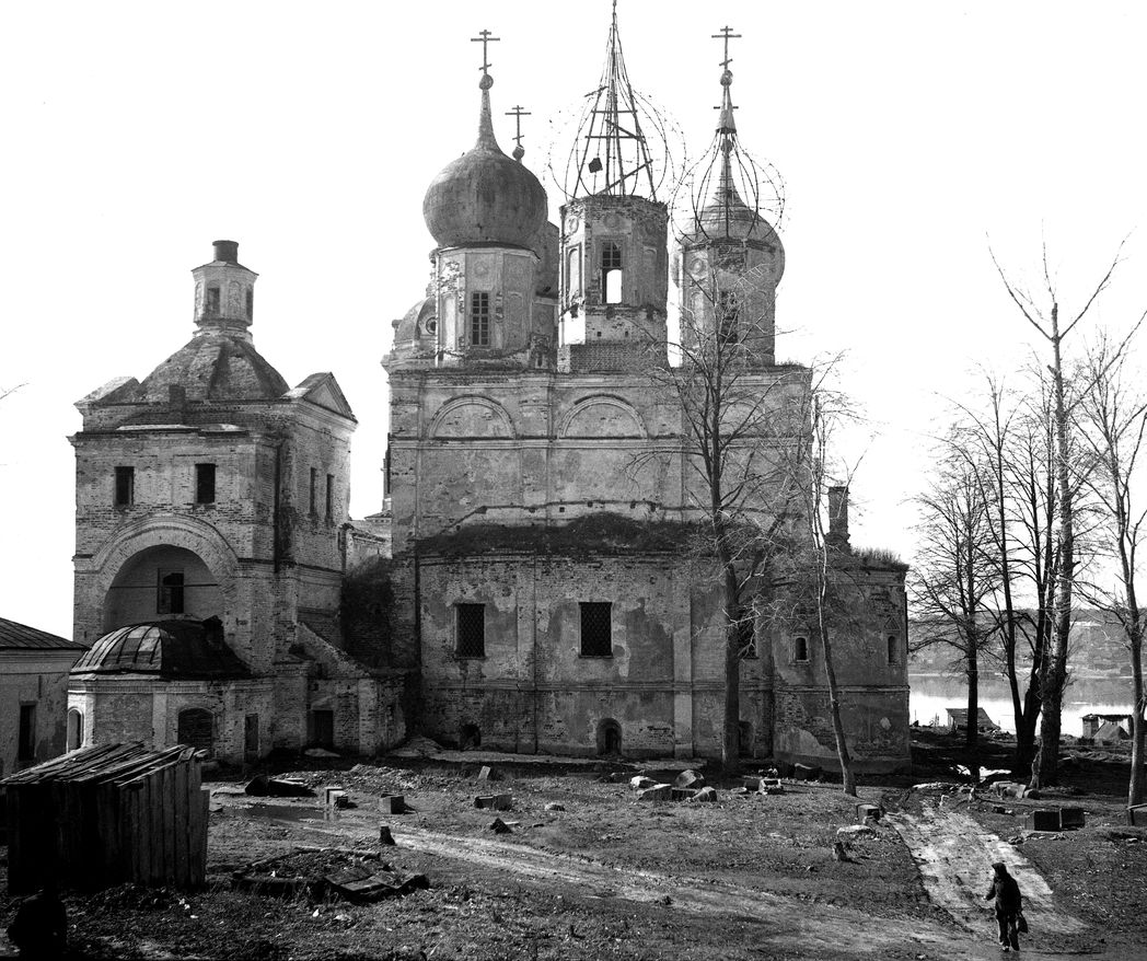 В начале Великой Отечественной в монастыре размещался 157-й Отдельный батальон аэродромного обслуживания. Как уже отмечалось, благодать хранила святыню от вражеских снарядов. А вот перед варварством граждан некогда Святой Руси обитель оказалась беззащитной. После войны сюда вселились всяческие конторы, организации и учреждения, склады, гаражи, коммунальные квартиры, здесь же были устроены загоны для скота. Некогда столь изящные строения монастырского комплекса ветшали и разрушались. К середине 1960-х годов три башни и большая часть стен обвалились. О Покровском храме в то время вспоминают так: «Западная часть его сгорела, купол был снесен, пол выломан, в стенах зияли пробоины, штукатурка снаружи и внутри полностью отсутствовала, кирпичная кладка рассыпалась». В таком же аварийном состоянии пребывали тогда все постройки.