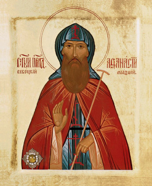 Вторым святым игуменом Высоцкого монастыря стал ученик преподобного Афанасия, преподобный Афанасий младший. Он почил рано – в возрасте тридцати трех лет, и с самого момента погребения прославился чудесами. При нашествии крымских татар под предводительством Девлет-Гирея жители города видели его в образе грозного всадника на белом коне, выехавшего из врат обители и обратившего врагов в бегство. За избавление града его стали почитать небесным покровителем Серпухова. Уже в наши дни при обретении мощей преподобного 24 сентября 1994 года происходили чудеса исцелений. Ныне мощи преподобного Афанасия младшего почивают в возрожденном Покровском храме монастыря.