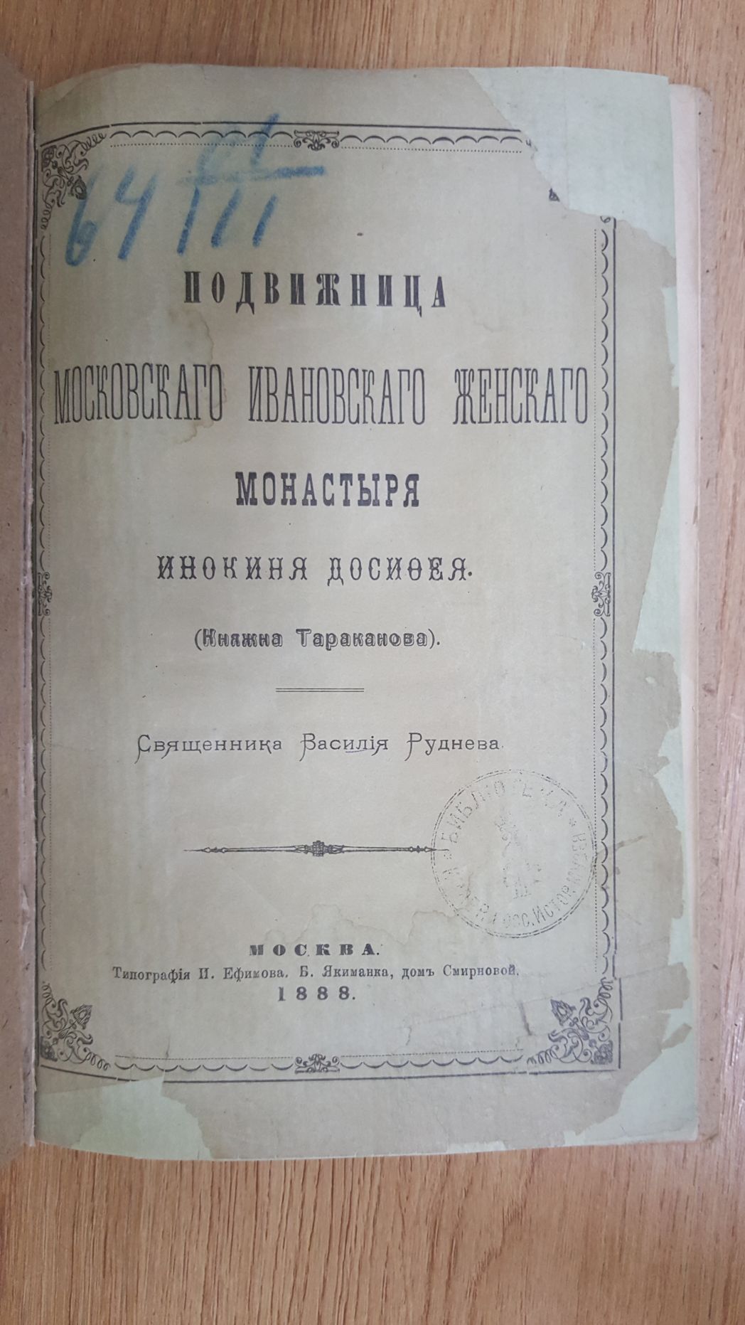 [2] Василий Руднев, свящ. (с 1901 г. – архим. Тихон). Подвижница Московского Ивановского женского монастыря инокиня Досифея (княжна Тараканова). М.: Тип. И. Ефимова, 1888. С. 13.