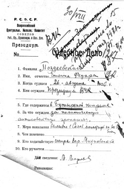 4 марта 1922 г. Президиум ВЦИК рассмотрел «ходатайство о помиловании епископов Поздеевского и Степанова, осужденных ВЧК», и постановил освободить их от наказания. Но уже 5 марта «Президиум ВЦИК во изменение своего постановления от 24/III-22 г. (так в деле. – Т.П.) постановил епископа Феодора Поздеевского и Степанова А.И. освободить по изъятии церковных ценностей».